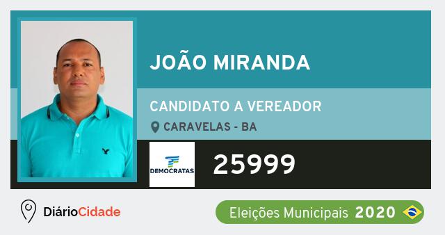 Candidato do DEM para Vereador, João Miranda obteve 291 votos e foi eleito Vereador em Caravelas nas Eleições 2020.