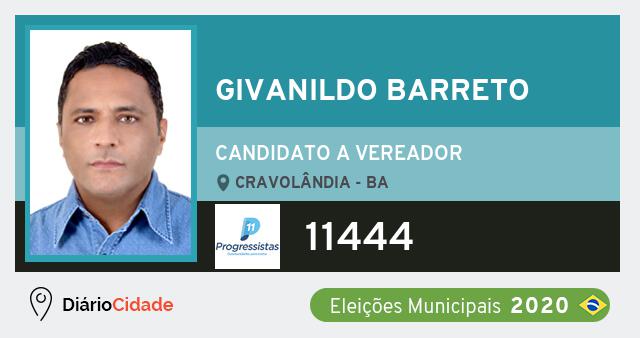 Candidato do PP para Vereador, Givanildo Barreto obteve 124 votos e foi eleito Vereador em Cravolândia nas Eleições 2020.