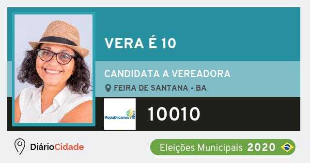 Candidata do REPUBLICANOS para Vereador, Vera É 10 obteve 38 votos e está como Suplente Vereador em Feira de Santana nas Eleições 2020.