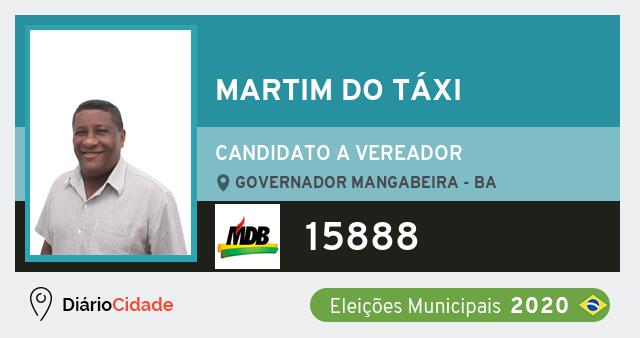 Candidato do MDB para Vereador, Martim do Táxi obteve 69 votos e está como Suplente Vereador em Governador Mangabeira nas Eleições 2020.