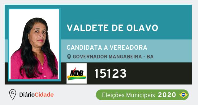 Candidata do MDB para Vereador, Valdete de Olavo obteve 14 votos e está como Suplente Vereador em Governador Mangabeira nas Eleições 2020.