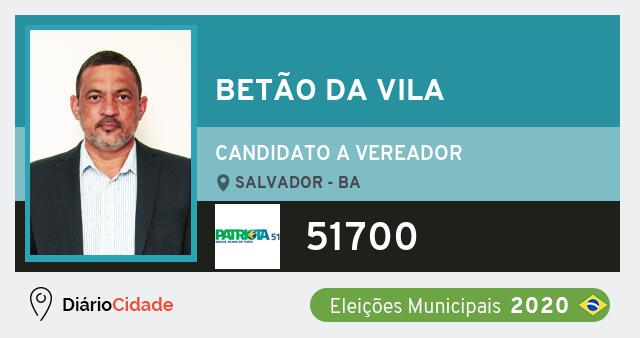 Candidato do PATRIOTA para Vereador, Betão da Vila obteve 1448 votos e está como Vereador em Salvador nas Eleições 2020.