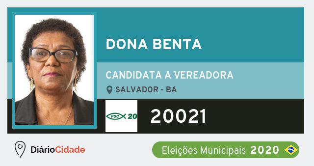 Candidata do PSC para Vereador, Dona Benta obteve 127 votos e está como Vereador em Salvador nas Eleições 2020.