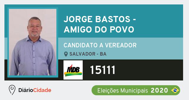 Candidato do MDB para Vereador, Jorge Bastos - Amigo do Povo obteve 933 votos e está como Vereador em Salvador nas Eleições 2020.