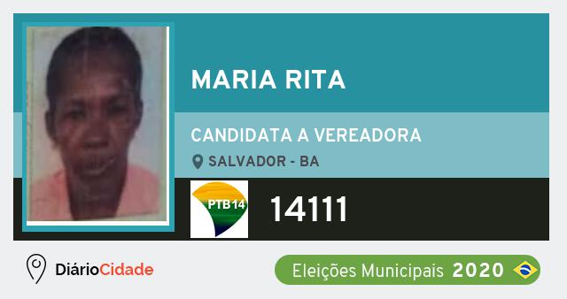 IndeferidoMaria Rita dos Santos foi candidata a Vereador em Salvador-BA nas Eleições 2020 pelo PTB (Partido Trabalhista Brasileiro). Natural de Salvador - BA, Maria Rita dos Santos tem 60 anos de idade.