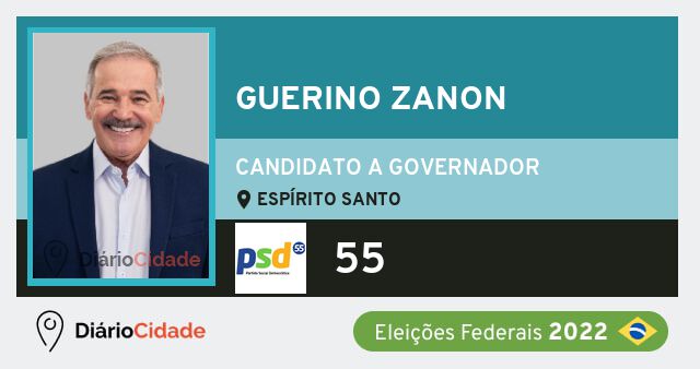 Não eleitoGuerino Luiz Zanon é candidato a Governador do Espírito Santo nas Eleições 2022 pelo PSD (Partido Social Democrático). Natural de Linhares - ES, Guerino Luiz Zanon tem 66 anos.
