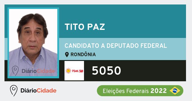 Não eleitoTito Soares Paz é candidato a Deputado Federal de Rondônia nas Eleições 2022 pelo PSOL (Partido Socialismo e Liberdade). Natural de Guajará-Mirim - RO, Tito Soares Paz tem 64 anos.