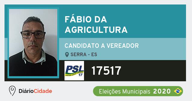 Candidato do PSL para Vereador, Fábio da Agricultura obteve 0 votos mas não foi eleito Vereador em Serra nas Eleições 2020.