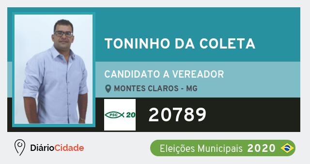 Candidato do PSC para Vereador, Toninho da Coleta obteve 1254 votos e está como Suplente Vereador em Montes Claros nas Eleições 2020.