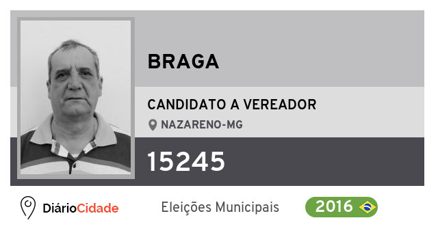 Candidato do PMDB para Vereador, Braga obteve 12 votos mas não foi eleito Vereador em Nazareno nas Eleições 2016.