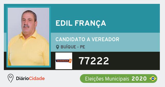 Candidato do SOLIDARIEDADE para Vereador, Edil França obteve 757 votos e está como Suplente Vereador em Buíque nas Eleições 2020.