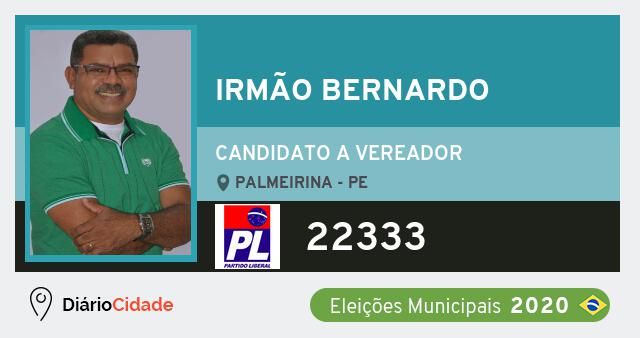 Candidato do PL para Vereador, Irmão Bernardo obteve 145 votos e está como Suplente Vereador em Palmeirina nas Eleições 2020.