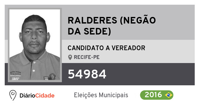 Candidato do PPL para Vereador, Ralderes (Negão da Sede) obteve 46 votos mas não foi eleito Vereador em Recife nas Eleições 2016.