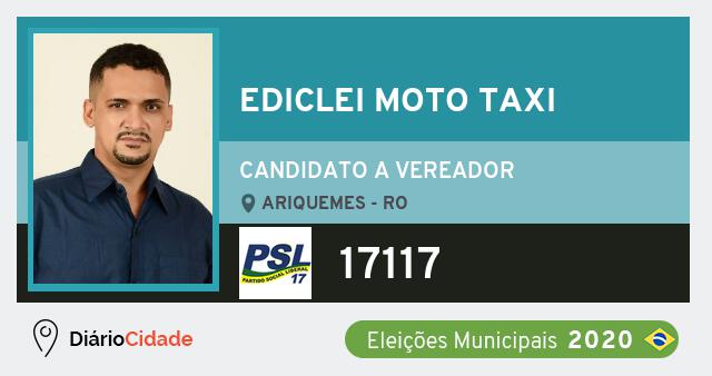 Candidato do PSL para Vereador, Ediclei Moto Taxi obteve 18 votos e está como Suplente Vereador em Ariquemes nas Eleições 2020.