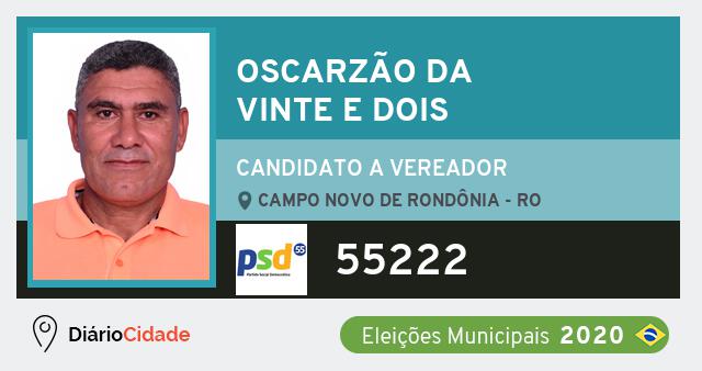 Candidato do PSD para Vereador, Oscarzão da Vinte e Dois obteve 111 votos e está como Suplente Vereador em Campo Novo de Rondônia nas Eleições 2020.