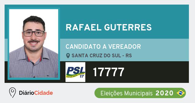 Candidato do PSL para Vereador, Rafael Guterres obteve 25 votos mas não foi eleito Vereador em Santa Cruz do Sul nas Eleições 2020.