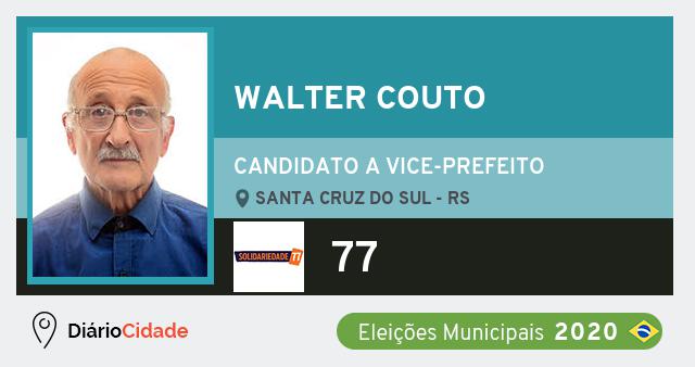 Não EleitoWalter Couto foi candidato a Vice-Prefeito em Santa Cruz do Sul-RS nas Eleições 2020 pelo SOLIDARIEDADE (Solidariedade). Natural de Santa Cruz do Sul - RS, Walter Couto tem 38 anos de idade.
