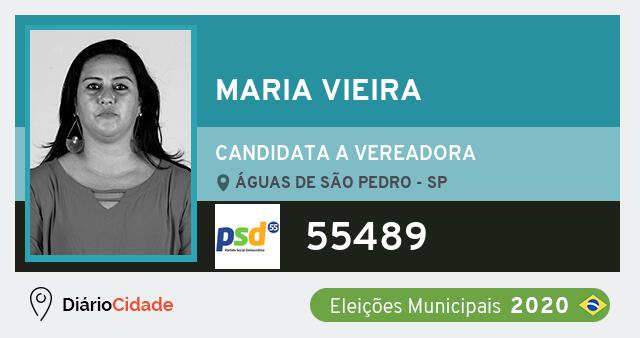 Candidata do PSD para Vereador, Maria Vieira obteve 2 votos mas não foi eleito Vereador em Águas de São Pedro nas Eleições 2020.