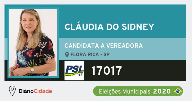 Candidata do PSL para Vereador, Cláudia do Sidney obteve 6 votos e está como Suplente Vereador em Flora Rica nas Eleições 2020.