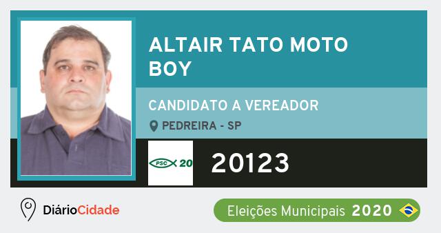 Candidato do PSC para Vereador, Altair Tato Moto Boy obteve 21 votos mas não foi eleito Vereador em Pedreira nas Eleições 2020.