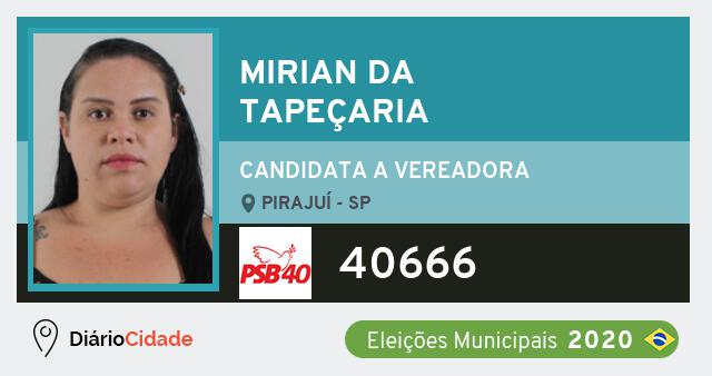 Candidata do PSB para Vereador, Mirian da Tapeçaria obteve 31 votos e está como Suplente Vereador em Pirajuí nas Eleições 2020.