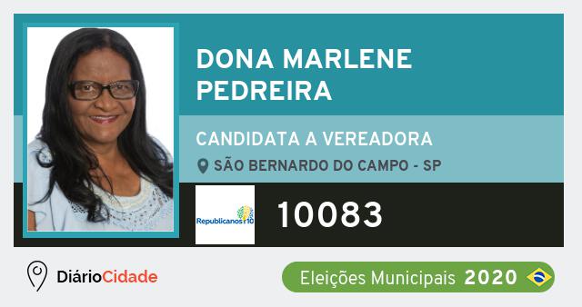 Candidata do REPUBLICANOS para Vereador, Dona Marlene Pedreira obteve 67 votos e está como Suplente Vereador em São Bernardo do Campo nas Eleições 2020.