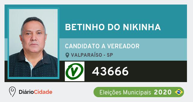 Candidato do PV para Vereador, Betinho do Nikinha obteve 46 votos e está como Suplente Vereador em Valparaíso nas Eleições 2020.